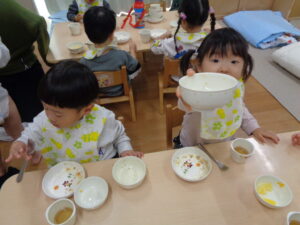 ふたば組さんをのぞいてみると、みんなジャージャー麵のお皿は空っぽ😊