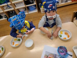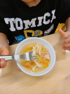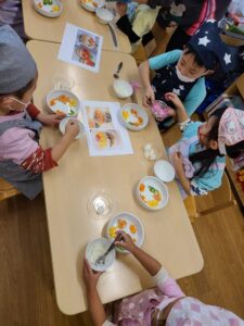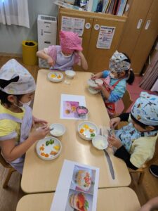 好きな料理を思い浮かべて、『かぼちゃが入ってるとおいしいよね』『なんのお肉がいいの?』などなど。。。いつも食べているお家のご飯や給食を思い出して考えていましたよ😄
