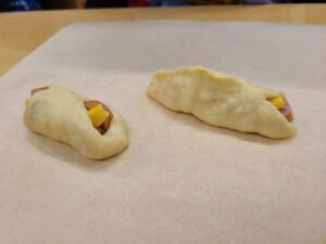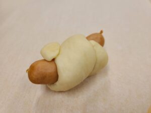 弾力のあるパン生地にコーンとウインナーを包みこむのが難しかったようで、苦戦しながらも、頑張る姿が見られました😽