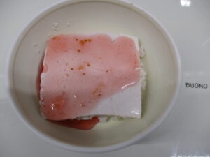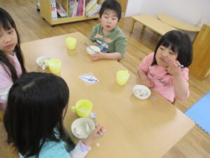 子どもたちは、ムースのふわふわな食感を楽しんだり、中に入っているいちごジャムの実や種を見つけたり、楽しみながらおやつの時間を過ごしていました(^^♪