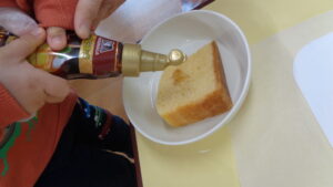 これを子どもたちの前で切り分けて順番に甘いシロップをかけたら
