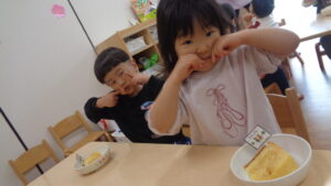 みんなで作ったカステラ美味しいね!といいながら