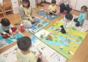 お部屋の中にレジャーシートを敷いて、ピクニックごっこをして食べました🍴