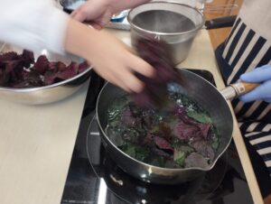 沸騰したお湯に赤紫蘇を入れると、葉っぱがみるみる緑色に(゚д゚)!