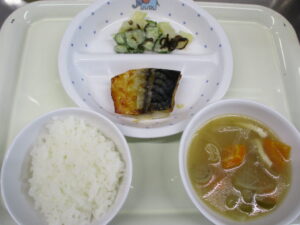 そして、今日の給食は、「ごはん、さばのみそ煮、五目汁、じゃがいもの塩昆布マヨ和え」でした。