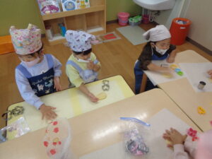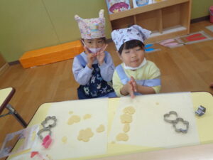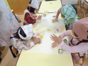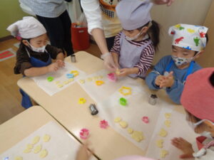 ふたば組に年中さんが来てくれて一緒にクッキーの型抜きを行いました。