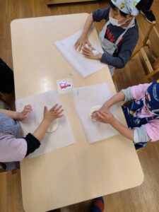 そらぐみさんは何度かパン生地を使ったクッキングをしていますが、めろんぐみさんは初めて☆