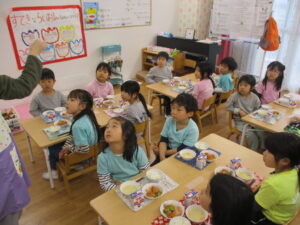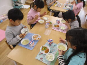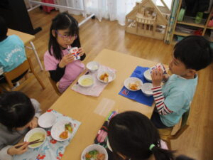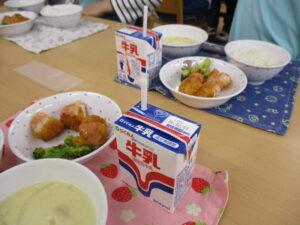 だんだんと持ち方にも慣れてきて、給食を食べながらパック牛乳を上手に飲んでいました。