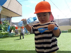 気温は高く暑かったですが、陰で水に触れると涼しさを感じながら遊ぶことができました♪