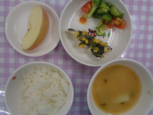 ・御飯 ・さわらの香味焼き ・みそ汁 ・ブロッコリーとトマトの黒ゴマサラダ ・りんご