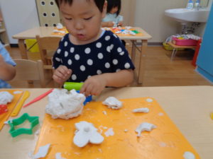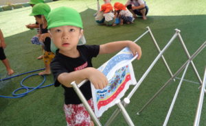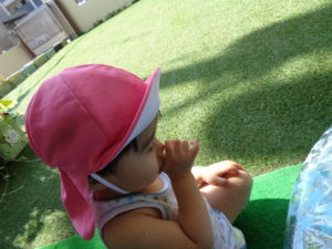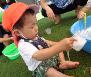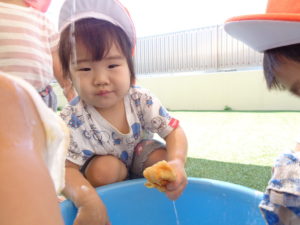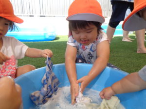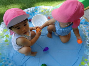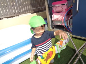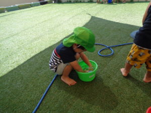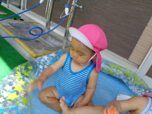もも組さんは、水遊びをしたり、室内で遊んだりしました。