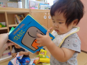 触れあったり、絵本にも興味津々で見ていました。