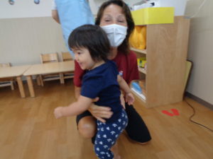 クリス先生が来ると、スキスキとハグしにいきます。