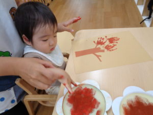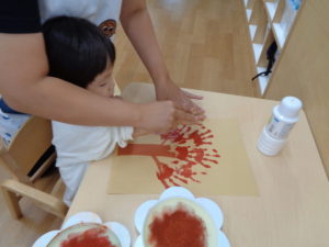 3歳児さんは、かぼちゃをハサミで上手に切ることができました✂