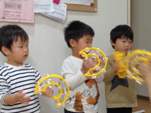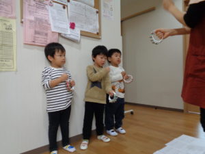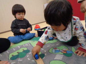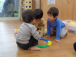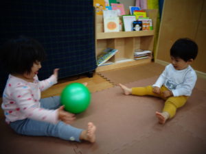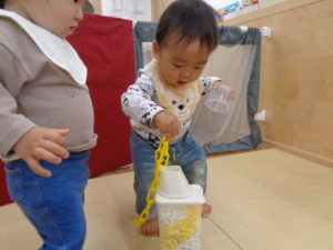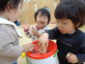 お部屋で、ボールやチェーン落とし、積み木のぽっとん落としなど