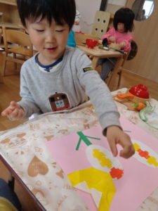 にじ組は制作で、折り紙で蝶々を折り、のりで貼りました。