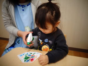 「ぶんぶんぶん」と聞くとみつばちの絵カードを、「ごしごしごし」と聞くと手洗いの絵カードを取る、といったように、色々な音を聞いてカードを取りましたよ!