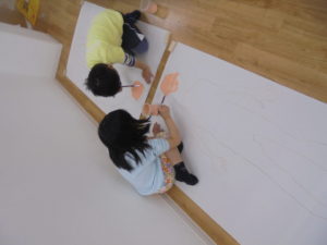 5歳児は卒園制作をしました。昨日の続きで、等身大の自分の色を塗っていきましたよ。