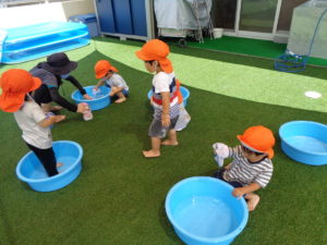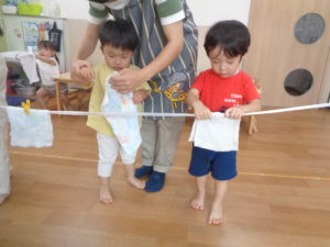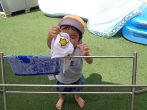 みかん組さんは、園庭でタオルをお洗濯.。o○