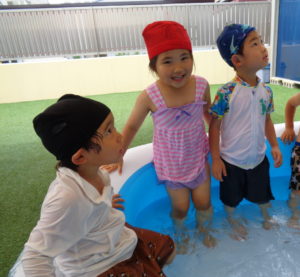 きちんと体操をしてから、遊び始めます。早く遊びたい気持ちが強すぎて、テンションが上がりすぎていましたが、プールでの約束事を、聞いてから、入ります。ワニ泳ぎや、ボール拾いも怖がることもなく、大はしゃぎ!顔に水がかかってもみんな、へっちゃらで、楽しんでいましたよ🤗