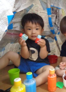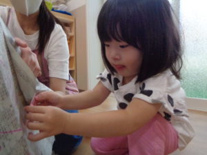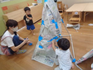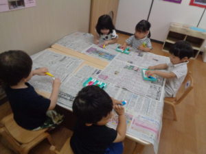 そして、保育者の話を聞いて、先ほどの土台に新聞紙をペタペタ・・・真剣に貼っています✨