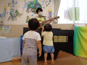 もも組さんは、みかん組さんと一緒にリトミックを楽しみ、
