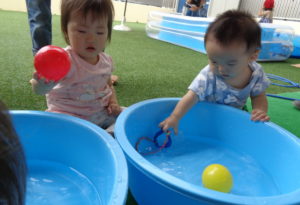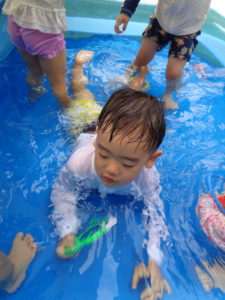 プール遊びでは、フラフープをくぐったり、プールの中のお魚を拾ったりしてあそびました。