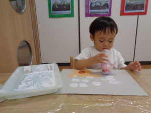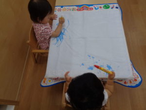 もも組さんはその後、シール貼りや水のお絵描きなど手先を使って遊びました。