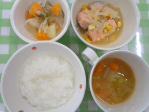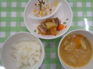 ・ごはん・揚げ魚とじゃが芋のケチャップ煮・味噌汁(白菜、油揚げ)・レンコンのウメマヨ和えでした。