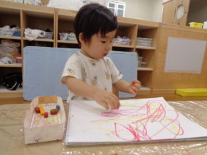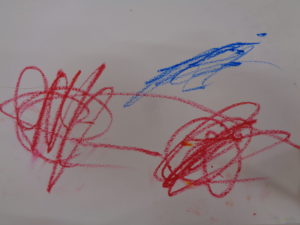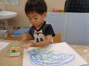 クレヨンの色を、「あか!」「あお!」「きいろ!」と少しずつ色も覚えてきて、確認しながら、画用紙いっぱいに絵をかいていました。
