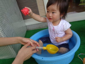 タライの中、きもちいい!!と、言わんばかりに大はしゃぎ!のお友だちや、外から水をさわって楽しむお友だち、