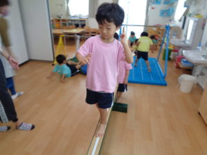 さすがにじぐみさん、支えなしでも自分でバランスをとりながら、上手に渡っています。