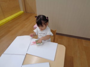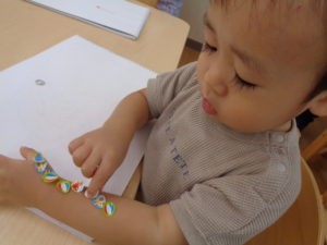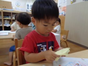 シール貼り、指先を上手に使って、剥がしたり、貼ったりしていますよ。