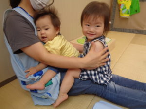 ”バスにのって”を保育者の足に乗って楽しみました。
