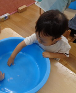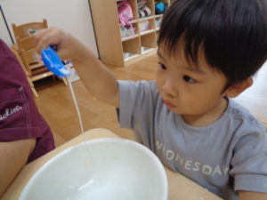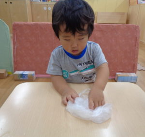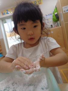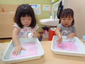 ふたば組さんは、片栗粉を使っての感触遊びです。