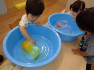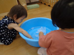 みかん組さんは、小さい氷や大きい氷で遊びましたよ!