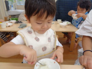 自分でスプーンで食べようと頑張っています(^^♪