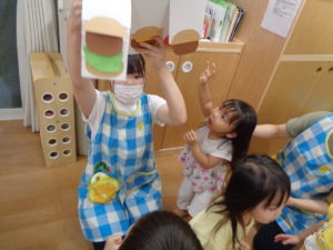 みんな大好きな”おいらひょっとこ”の絵本を見ながらまねっこしました。