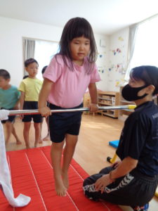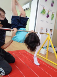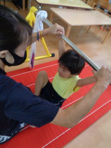 4歳児さんは平均台では初めてひとりでのぼれたお友だちがいました!!すごいですね!!鉄棒はタオルを補助につかっての逆上がりをしました。自分のチカラで頑張ってできるようになってきています😊運動会が楽しみです♬