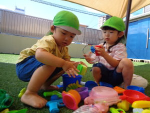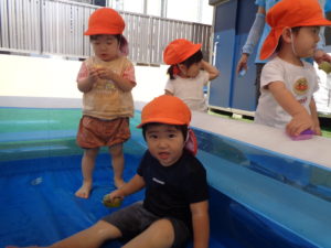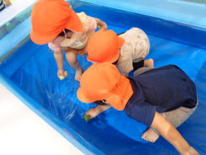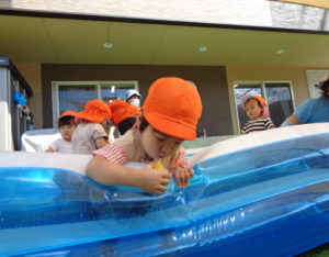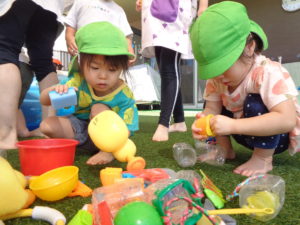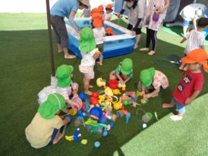 この夏に楽しんだプールあそびのプールやおもちゃをみんなで洗いました!