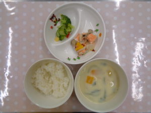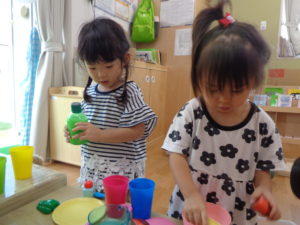 1歳児さん、いつもは1人遊びをしていることが多くみられますが、今日お友だちとおもちゃのコップを“かして” “どうぞ”のやりとりをしてから乾杯するかわいい姿が見られました♡