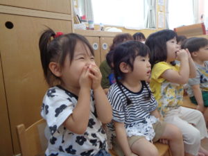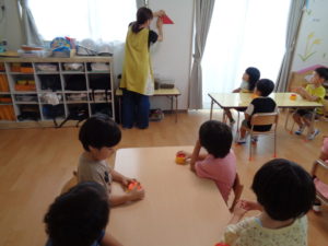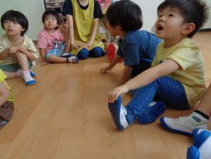 にじ組さんは、一人ずつ自分の名前を英語で行ったり、ごはんやパンなどの子どもたちが知っている食べ物を聞いて発音したりしました。