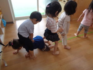 お部屋でみんなの足でトンネル作ってくぐる遊びをしました!