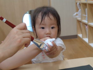 英語の後は、園庭で運動会の練習や手形を取りました。