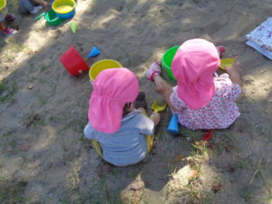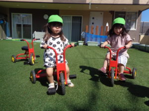 園庭で遊びました。三輪車に乗ってお友だちとお出かけかな?ボールの上に座ってお話。なんだか楽しい会話が聞こえてきそうですね!