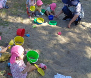 公園の砂場で遊んだり、スプリング遊具に乗って遊んだりしました。砂の感触を味わったり、遊具でユラユラ揺れたりすることを楽しみました。スコップで上手に砂をすくっていますね!
