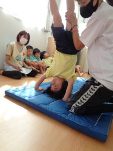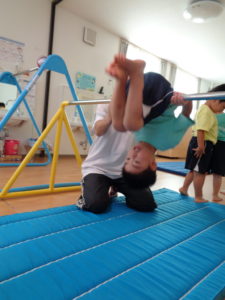 4歳児さんは、体操教室では3点倒立と逆上がりをしました。逆上がりは、自分の腕の力を使って体を引き寄せて上がれるようになりました。