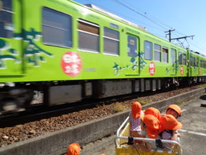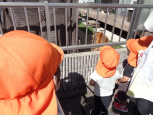 保育園の周辺をお散歩しました。犬のリリーちゃんに挨拶をした後、電車を見に行きました。散歩の途中で、ショベルカーやトラックを見つけると「ガーガーおった!」「あおー」など、自分の感じたことを言葉で伝えていました。