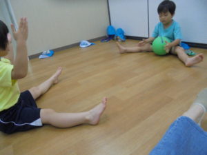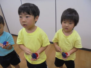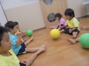 リトミックでは、「やきいもグーチーパー」に合わせて楽器ごとに部分奏をしたり、ドレミファソの音階に合わせてお友だちとボールを転がしました。ボールの弾むも楽しんでいました。