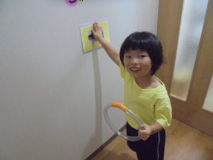 リトミックでは、「バスごっこ」に合わせてバスを探しました。音楽に合わせて止まったり動いたり。音楽をよく聞いて出来ていました。